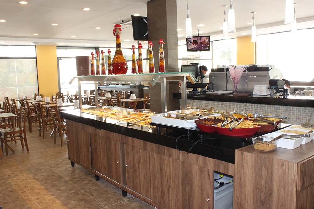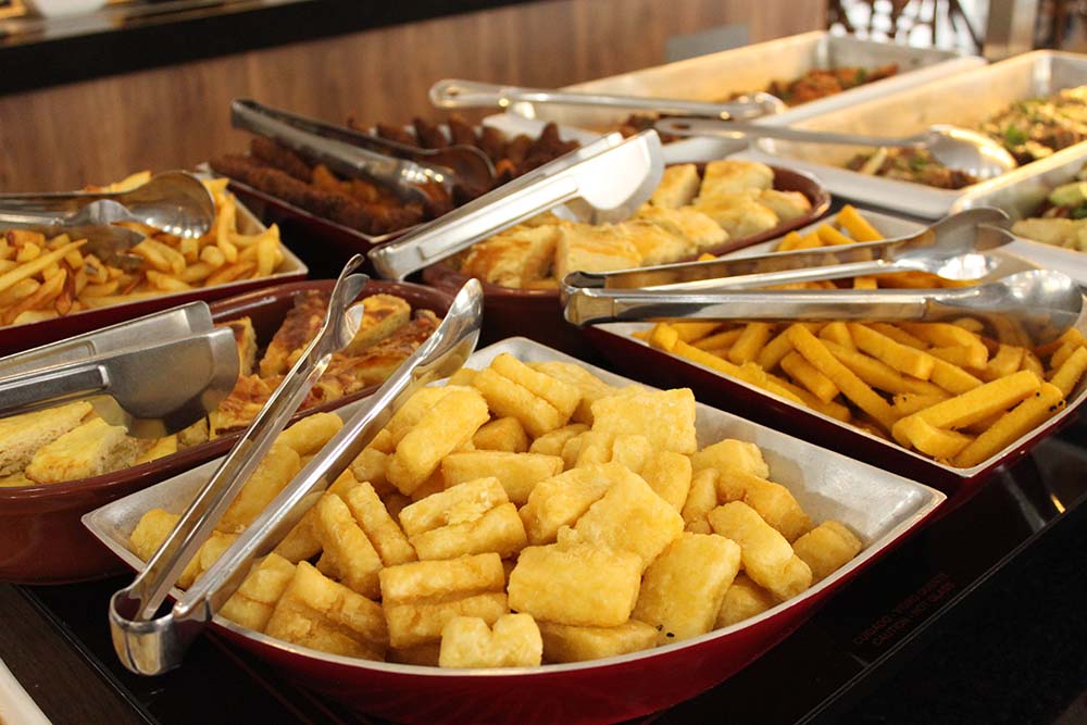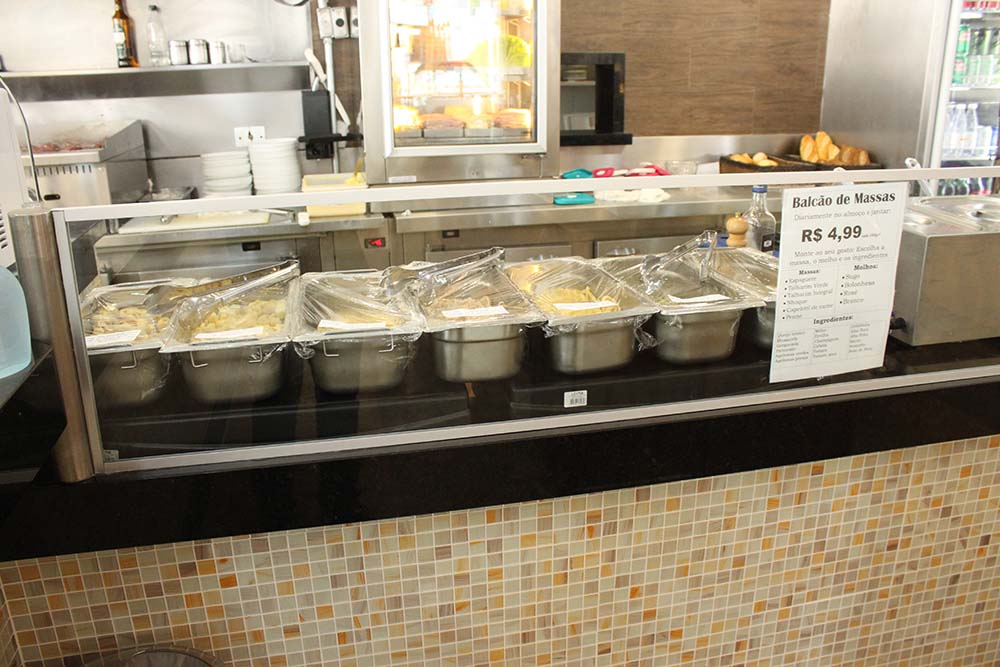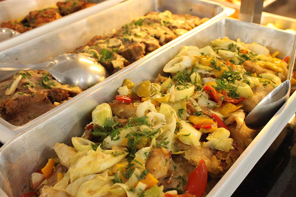 Almoço self-service com variedade de saladas, sushi e pratos quentes. Exceto às terças-feiras.
